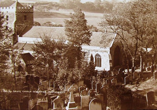 All Saints Church (or All Hallows as it was once called) is commonly referred to as 'The Upper Church' by old families from Hastings. There was a Norman church on this site, referenced to by Cole as having been mentioned in 1291 [1], which probably was partially destroyed in the French Raids of 1377. [2]