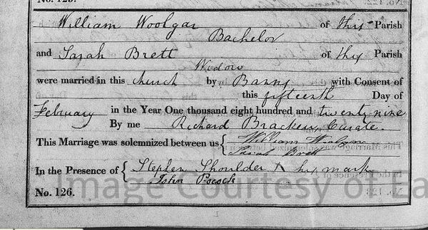 Register entry for William Woolgar's marriage to Brett's mother[2]