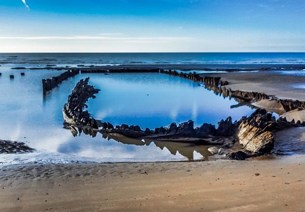 At low tides her ribs and large masses of timber from the ship's upper structure may be seen. It is, however theorised that the vessel has suffered a broken back, preventing the removal.[6]