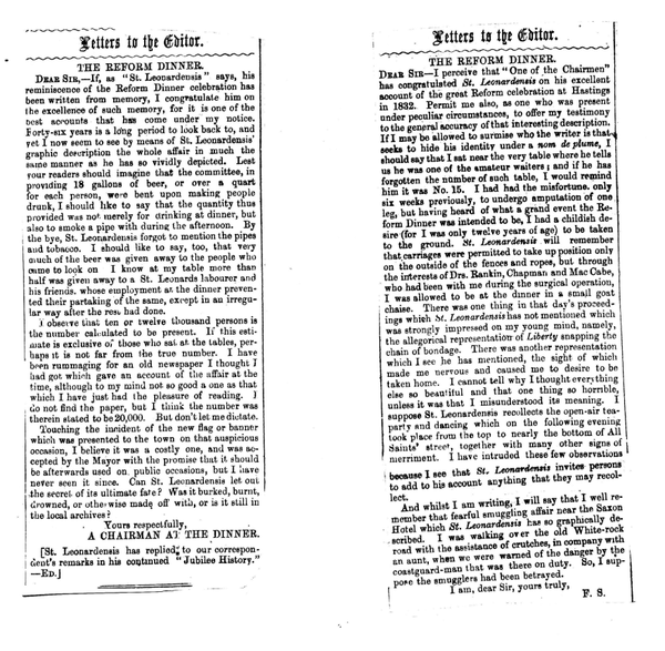 After the first appearance of the foregoing narrative "A Chairman at the Reform Dinner," whilé complimenting me for presenting a "generally true picture," thought that my estimate of ten or twelve thousand persons present during the day was much too low. His own estimate was nearer twenty thousand. My correspondent, however, misread my words. I said such number was computed to be present at one o'clock. For aught I know, his own estimate of 20,000 during the day may have been near the mark. Of course there were not 20,000 inhabitants at that time, but, as I stated, people came by thousands from the adjacent towns and villages. The census of the previous year showed the population of St. Leonards (which embraced the parishes of St. Leonards and St. Mary Magdalen) to be 1,300; and the population of Hastings to be 10,231. It is clearly certain, then, that if there were 20,000 persons present at that grand fete, nearly or quite one half of them were non-residents of the borough. Equally certain it is that the nearly 6,000 persons who dined together on that occasion constituted a very large proportion of the inhabitants. I may mention, incidentally, that the cost of taking the census for the parish of St. Leonards in 1831, was a very moderate one, namely 26s. 2d. to Mr. John Phillips as Vestry Clerk, and’ 30s. to the overseers and assistants. As regarded the destiny of the large flag which was presented to the town by the inhabitants of Holy Trinity I was not able to give "a chairman" any information, but I expressed ‘a hope that if it was still in existence it might be exhibited, if only as a curiosity; or, if it had been purposely madé away with, some one would be good enough to let the subscribers or their descendants know how, when and where.