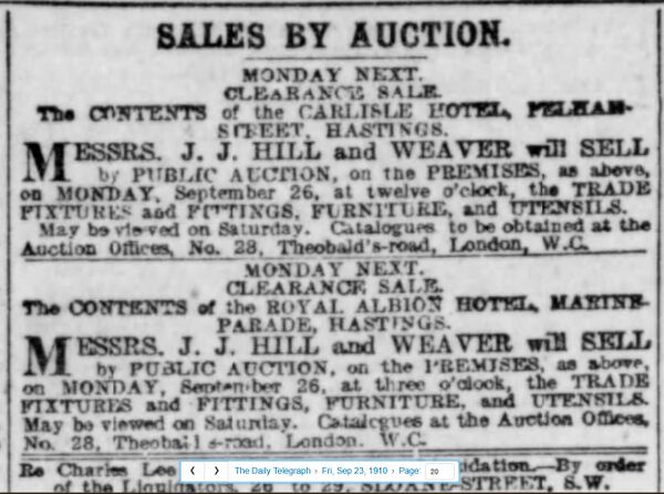 On the 26th of September 1910, the contents of the hotel were put up for auction by Messrs. J. J. Hill & Weaver of London, the sale being advertised nationally in the Daily Telegraph of 23rd September that year.