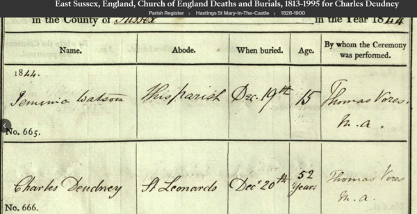 Charles Deudney was resident at 105 (now 116) Marina at the time of his death. Leaving a widow and five children[1], Charles was buried in St. Leonards by the Rev. Thomas Vores, incumbent at St. Mary In The Castle church on the 19th of December 1844. The terms of his will stipulated that all of his property was to be sold and the proceeds to be placed into trust and disbursed to his wife (providing she did not remarry) and children in equal parts, the resulting funds being declared as being below £3,000[2].