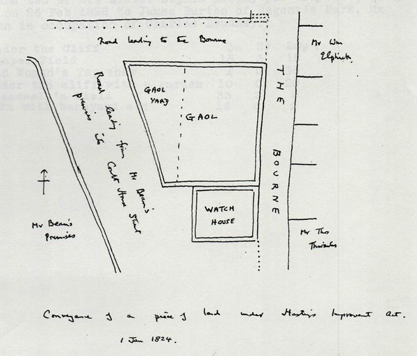 Location map of Hastings Gaol in 1824. Taken from Histories of Hastings' Houses and Properties in three volumes: J. Manwaring Baines - Hastings Museum and Art Gallery