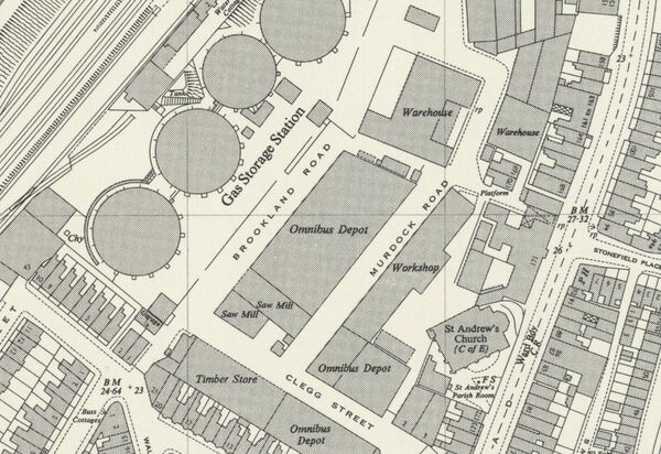 A red brick building facing onto Queen's Road housed the showrooms for customers of the company, with workshops behind. By 1908, a series of roads had been constructed on the land which the Gas Company intended to become public highways connecting Brook Street to Waterworks Road. A number of councillors were already connected with the Gas Company, which caused some scandal when the gas-works relocated to Glyne Gap (to avoid the 'tax' on coal landed within the borough) and the same councillors were pushing for the roads to be dedicated, but other councillors were concerned regarding ownership of the various slivers of land needed to construct the entrance and the possible demolitions required to form the entrances. This was in addition to concerns that some councillors were 'profiteering' by means of their financial holdings within the company, which for a time, effectively was the largest rate-payer in the town moving out of the borough to pay lower rates to a different council[4]. By 1927, a timber yard had appeared on the site and a bus depot was shown on 1938 mapping, with the roads that had formed; Brookland Road, Clegg Street (running parallel to Brook Street) and Murdock Road appearing on 1956 mapping[5] It would appear from the deeds that the now-lost roads on the site were planned in 1923, with a restrictive covenant placed on the land prohibiting the usage of any buildings as a beer-house in competition with The Fountain or The Princes in South Terrace (these premises opening in 1864) and no more than six dwelling houses being permitted dating to the 1866 sale of land.